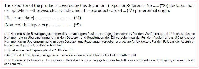 WICHTIG: Das Ursprungsland und der Wert der Waren muss genau berechnet und angegeben werden, die Verantwortung obliegt dem Versender. Für Sendungen aus der EU nach Großbritannien: Die Präferenzerklärungen müssen bei Sendungswerten unter 6.000 EUR original unterschrieben sein, sofern der Ausführer nicht über eine Bewilligungsnummer als "Ermächtigter Ausführer" verfügt und diese angibt. Bei Angabe einer Bewilligungsnummer (Exporter Ref. No) ist keine Unterschrift erforderlich.