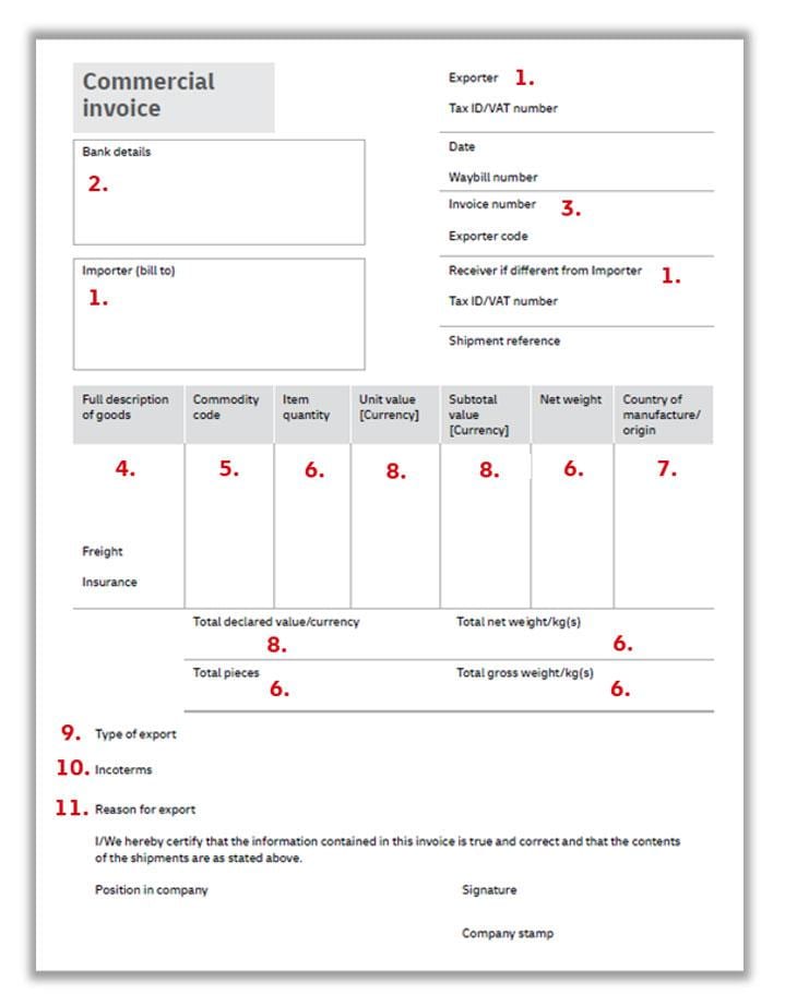 Für alle Sendungen außerhalb der EU wird eine begleitende Handelsrechnung oder Proformarechnung benötigt. Hierfür gibt es einige Pflichtangaben, je detailgenauer aber auch zusätzliche Angaben bereitgestellt werden, desto hilfreicher ist das für die Verzollung. Denn grundsätzlich tragen alle dazu bei, die Bearbeitung der Warensendung bei der Einfuhr zu erleichtern und zu beschleunigen.