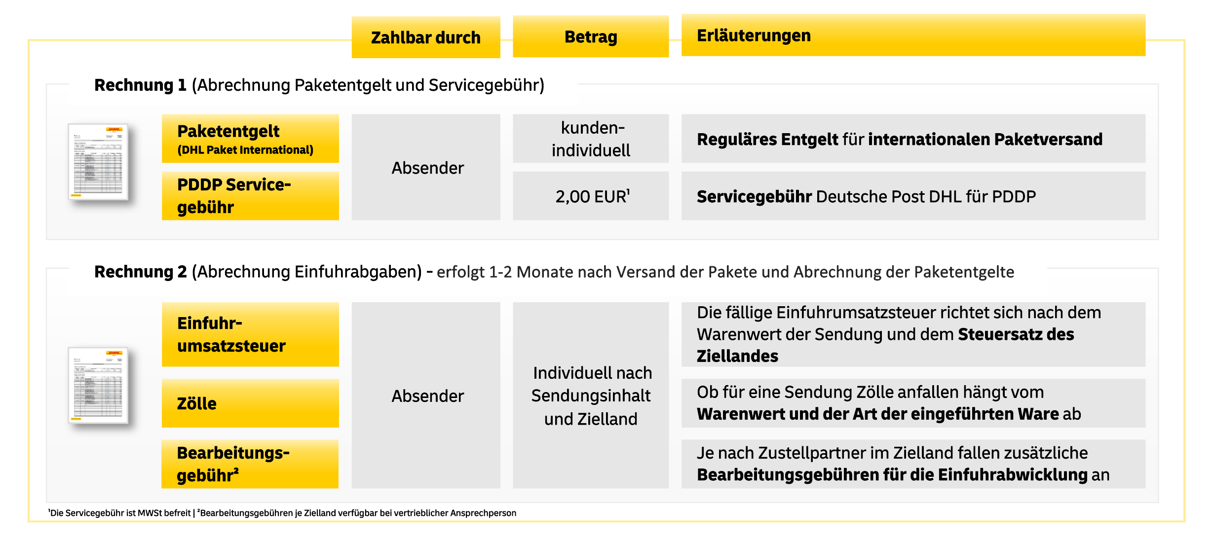 Die Abrechnung der PDDP-Servicegebühr erfolgt gemeinsam mit der Abrechnung des Paketentgelts und der übrigen Leistungen und Services. Die Abrechnung der Zollabgaben und Bearbeitungsgebühren erfolgt mittels separater Rechnungsstellung.
