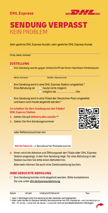 Sie waren zum Zeitpunkt der Zustellung Ihrer Express-Sendung nicht zu Hause? Kein Problem! Ihre Sendung wurde in einem nahegelegenen DHL Service Point/einer Filiale für Sie hinterlegt - holen Sie sie einfach direkt ab oder buchen Sie eine erneute Zustellung.